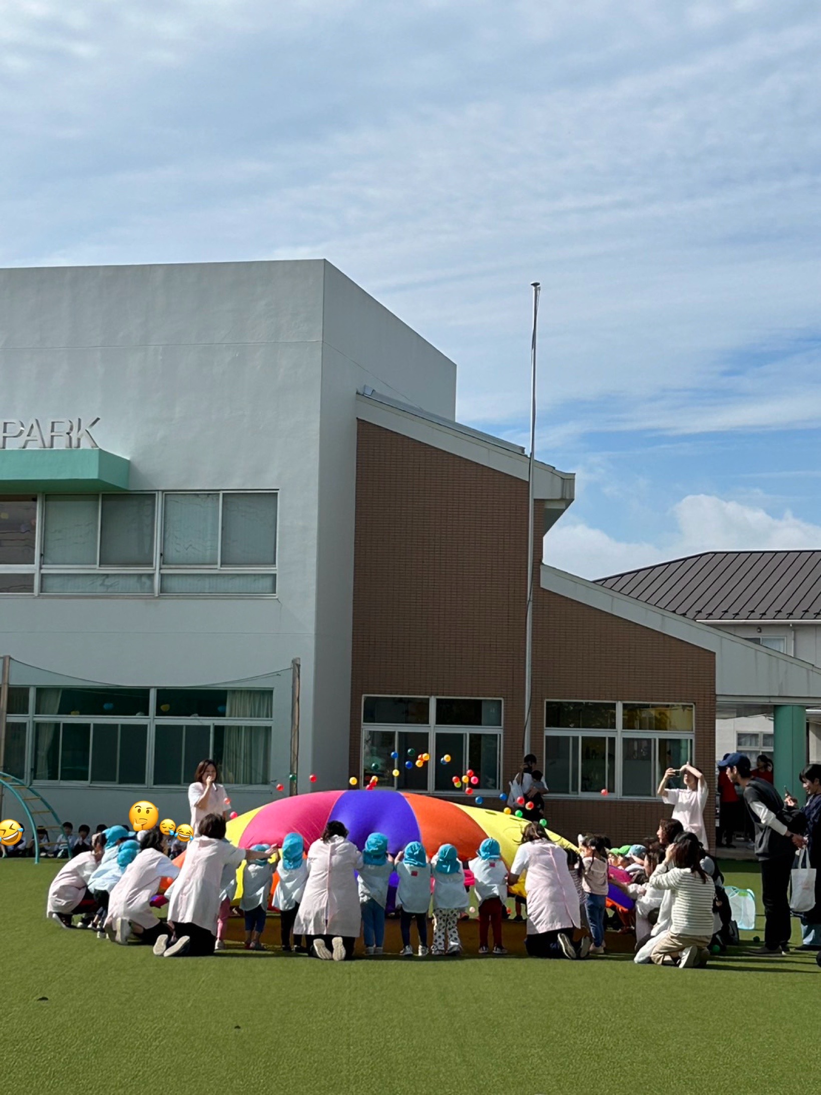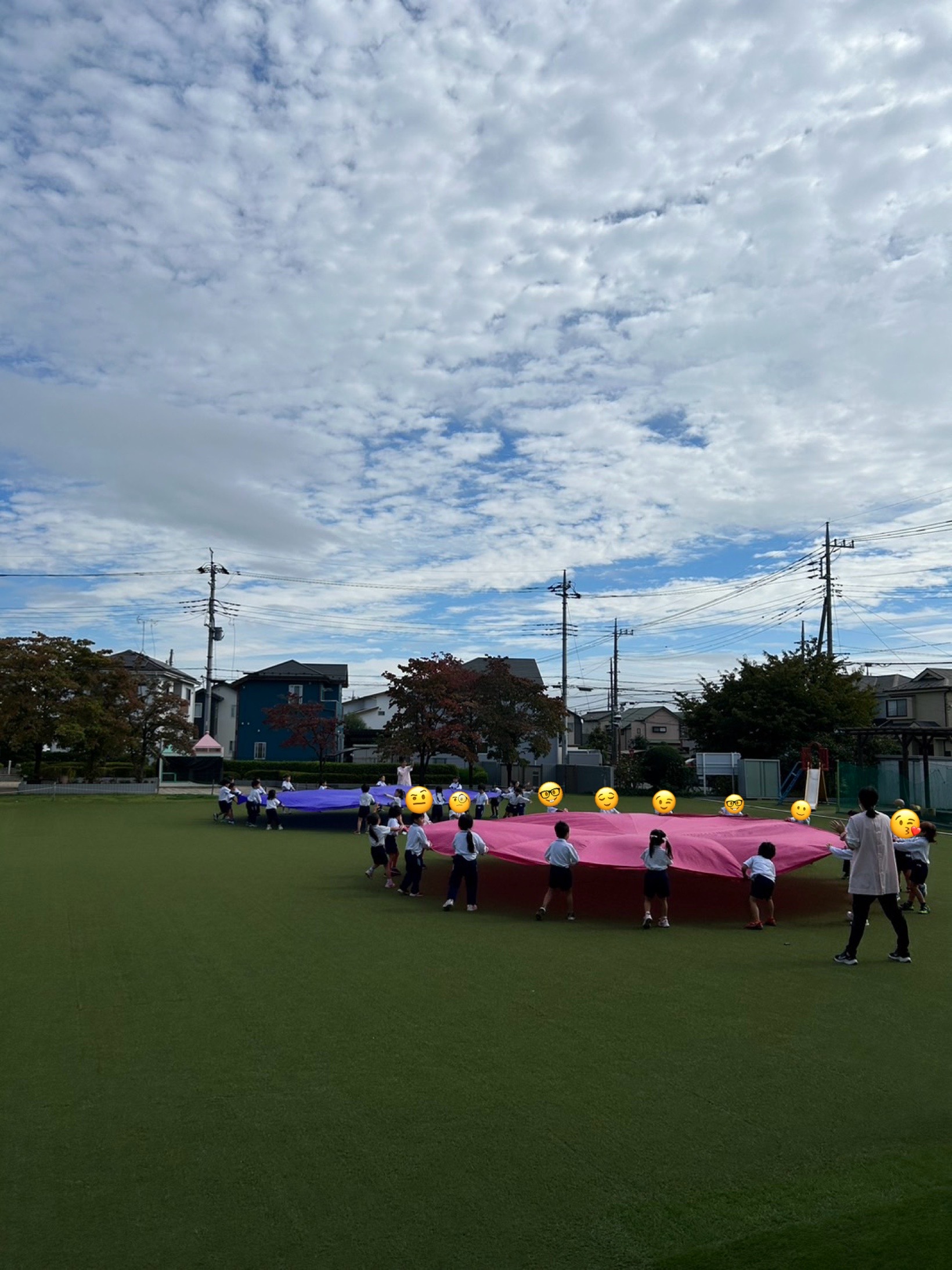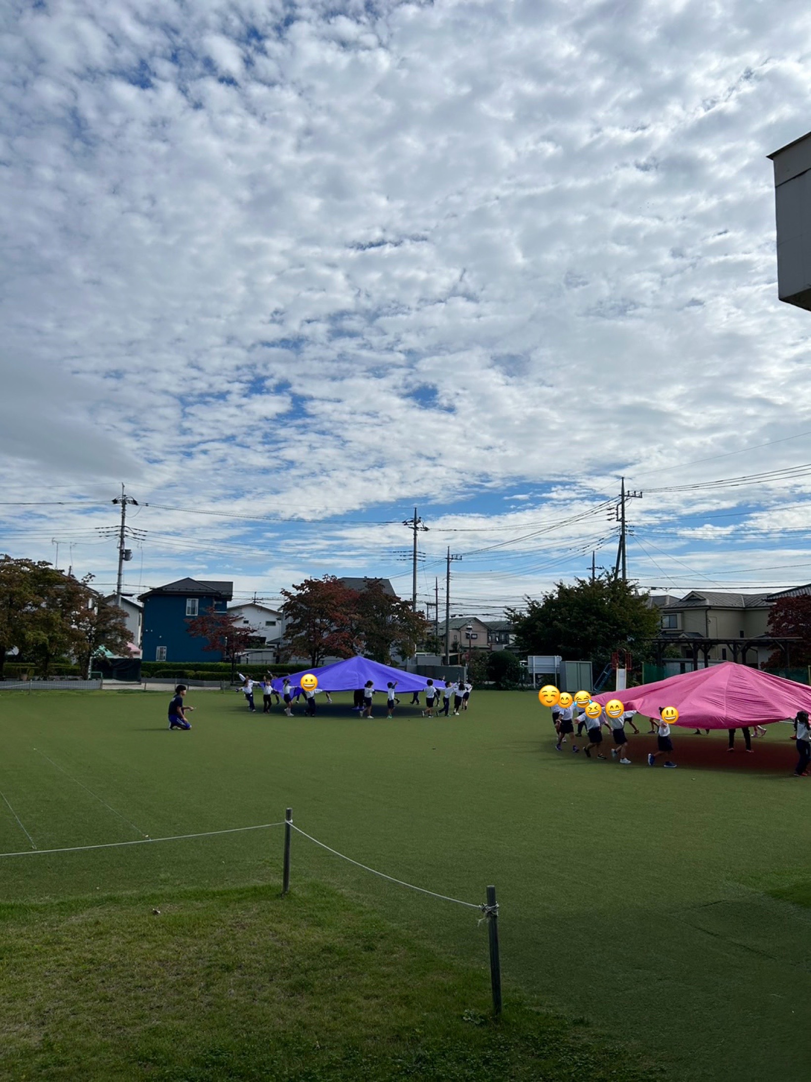 途中雨も上がり日がさし年中さんが運動会で披露したパラバルーンを園庭で見学できました