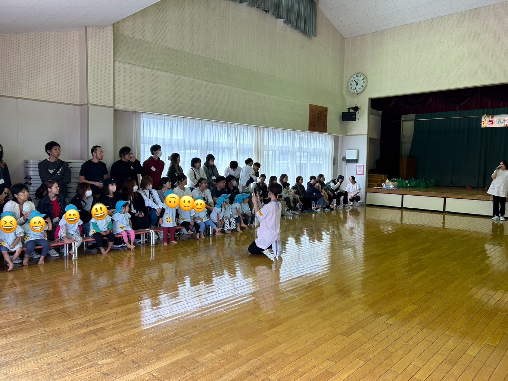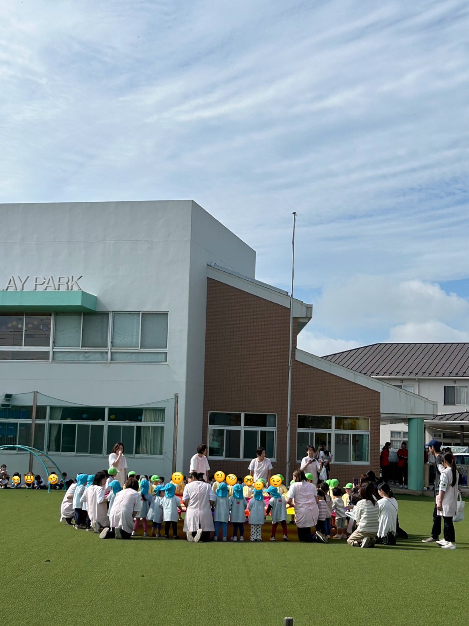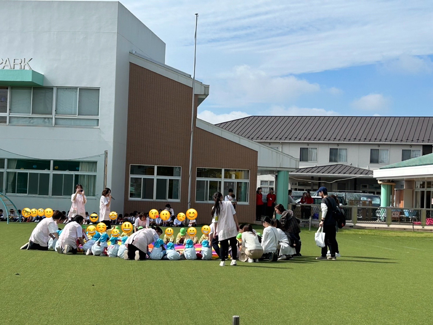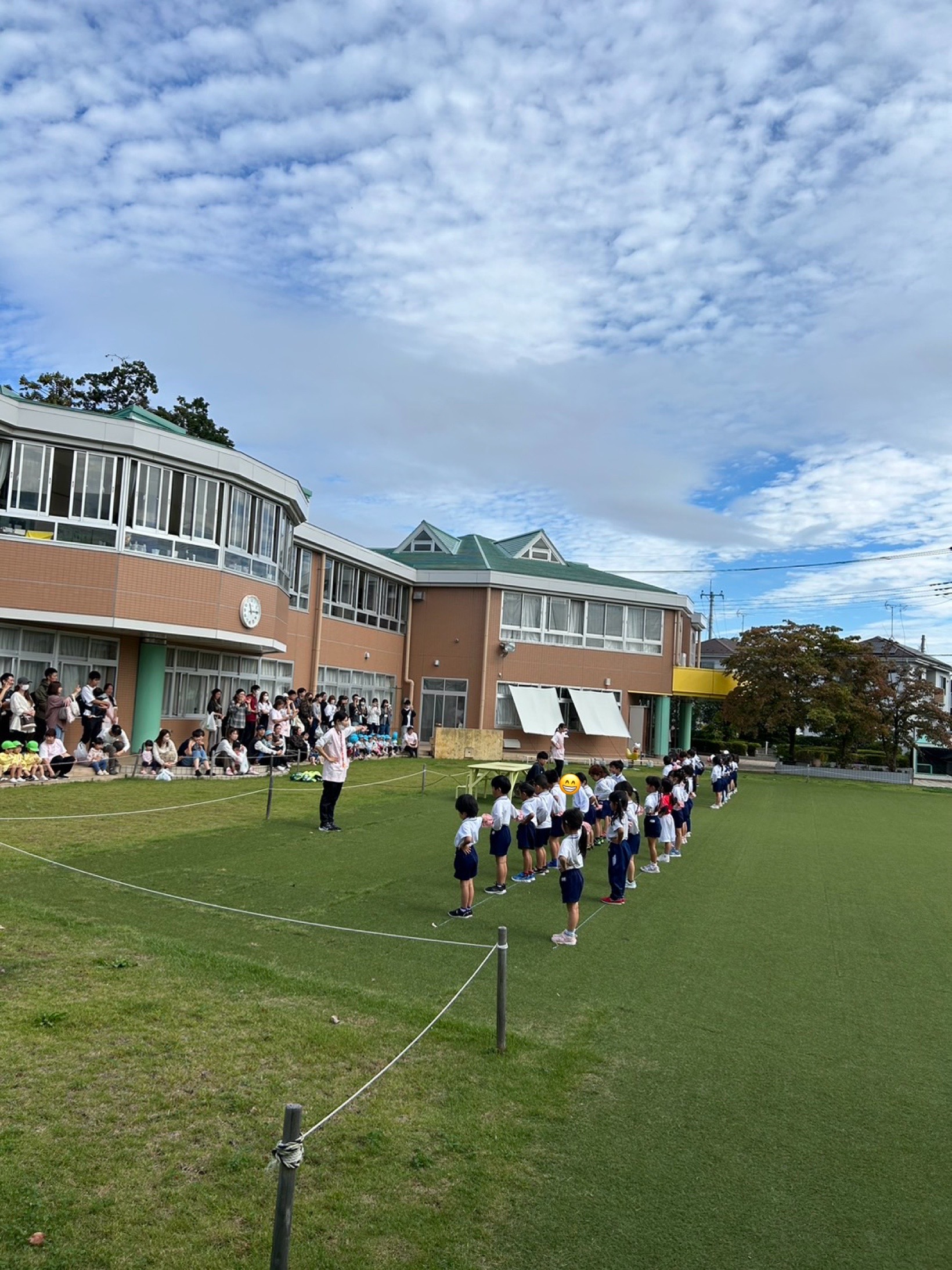 途中雨も上がり日がさし年中さんが運動会で披露したパラバルーンを園庭で見学できました