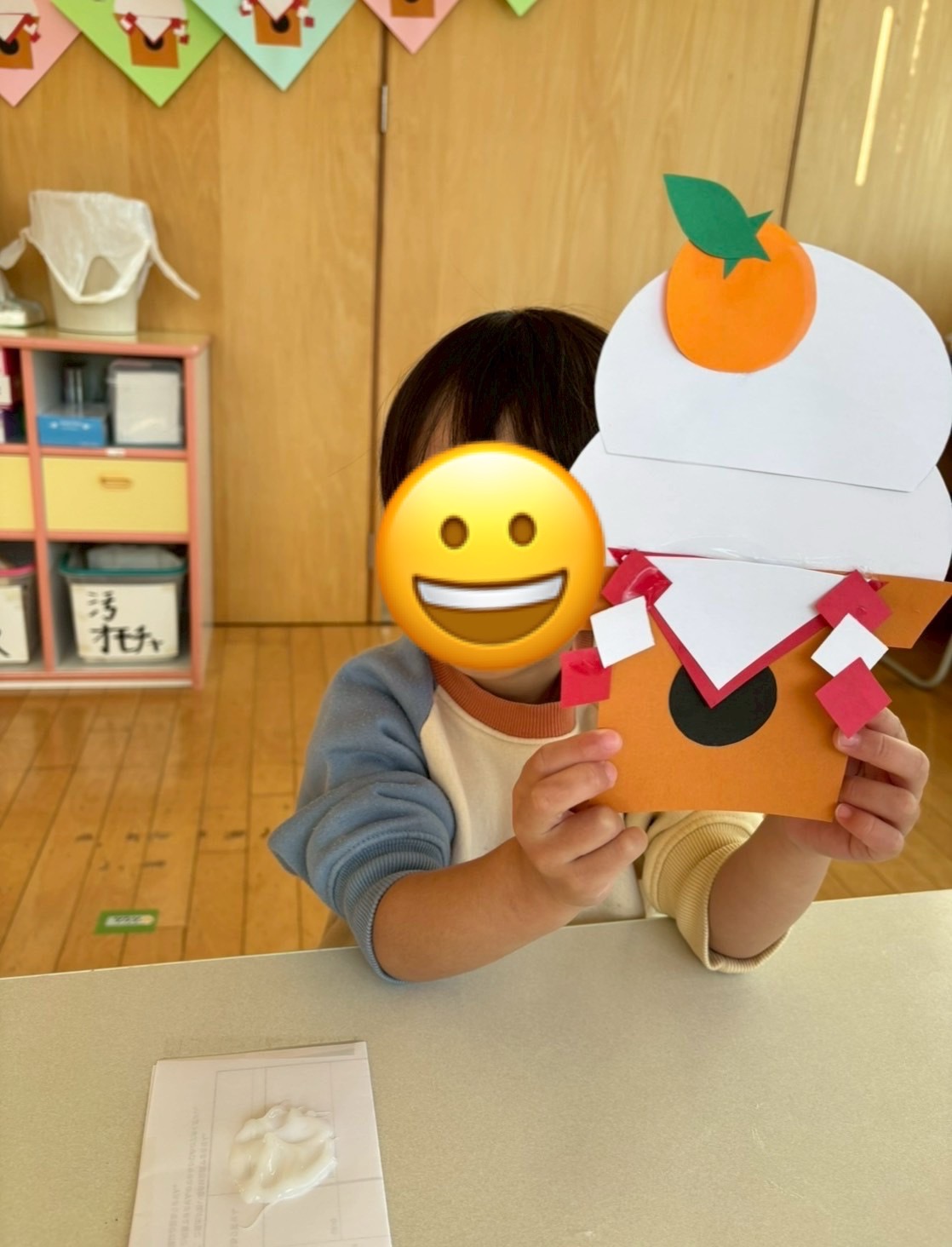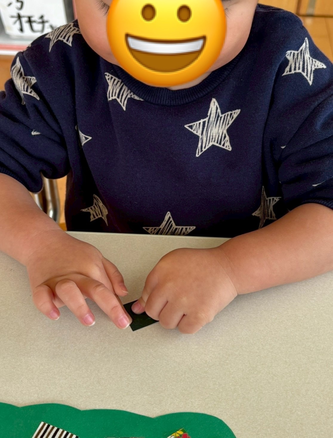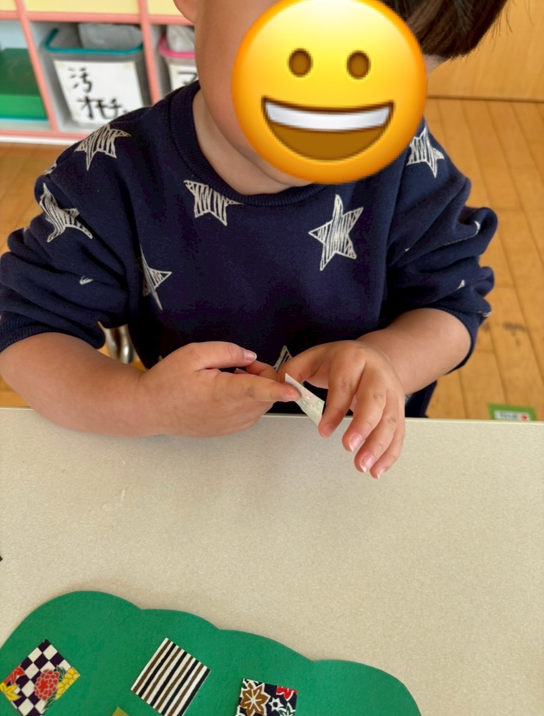 小さい折り紙をしっかり押さえて糊をつけています。加減や集中力が身についているのがわかります🥰